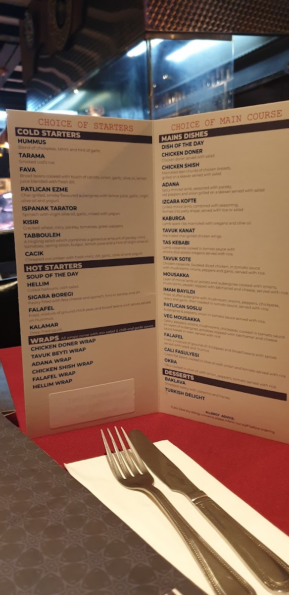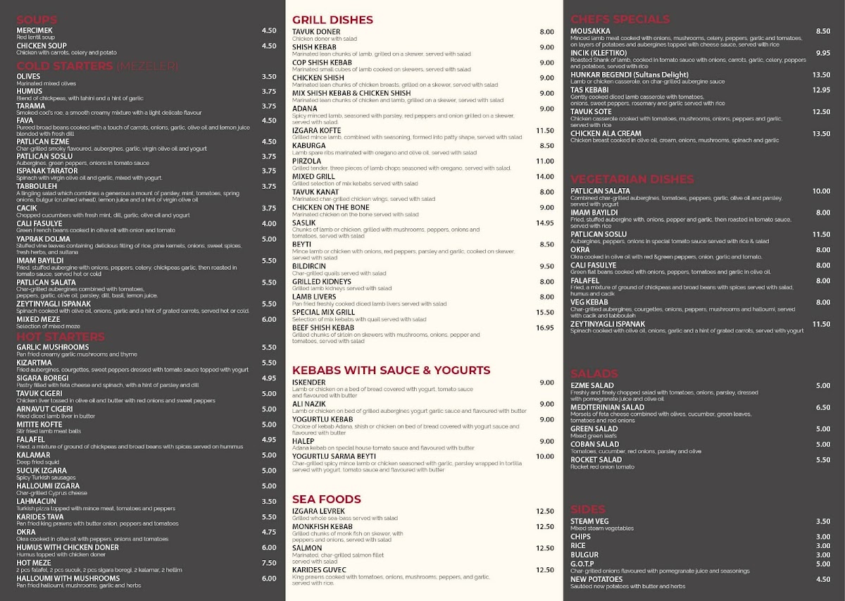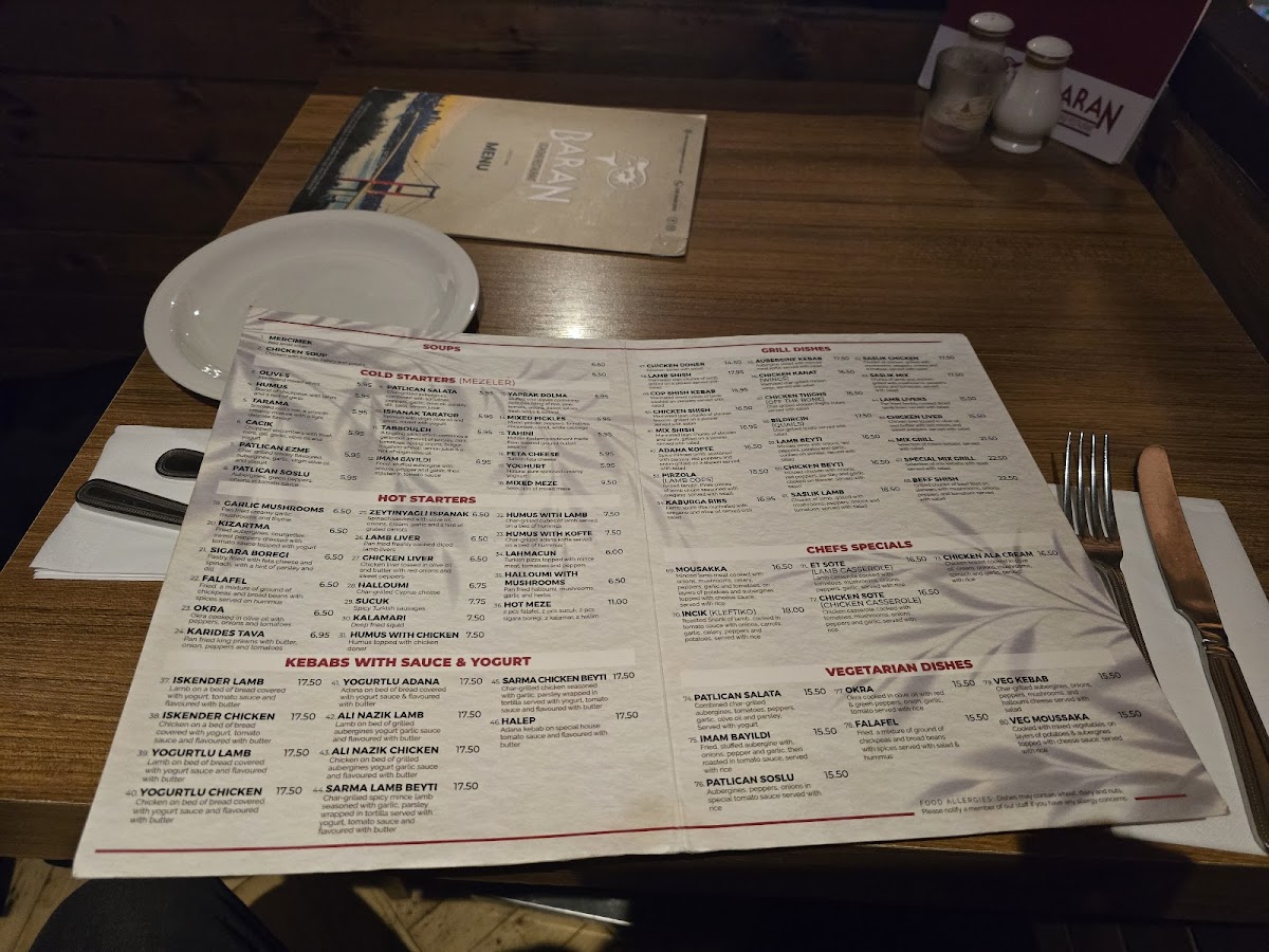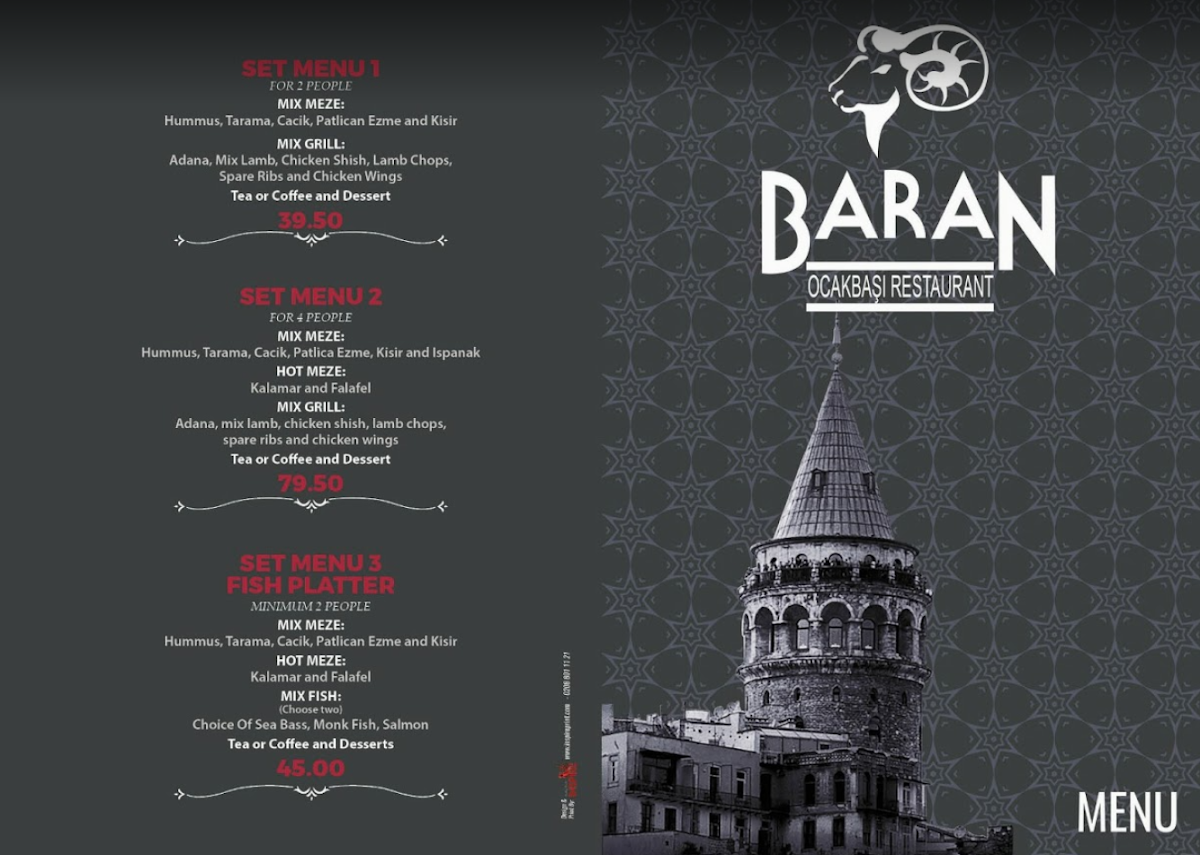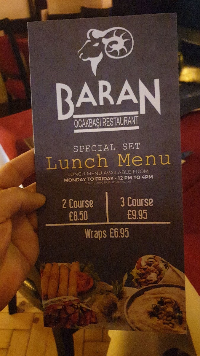 From a reviewer’s perspective, the menu at Baran Restaurant feels like a carefully curated journey through classic Turkish and Mediterranean cuisine, bringing together comfort, variety, and authenticity in a well-balanced way. The selection of Cold Starters such as Olives, Humus, Tarama, Fava, and Patlican Ezme sets a fresh and inviting tone, while the Hot Starters - including Garlic Mushrooms, Kizartma, Sigara Boregi, Tavuk Cigeri, and Arnavut Cigeri - add warmth and depth with rich, familiar flavors. Moving into the heart of the menu, the grill shines with options like Tavuk Doner, Shish Kebab, Cop Shish Kebab, Chicken Shish, and the generous Mix Shish Kebab & Chicken Shish, all reflecting the restaurant’s strength in charcoal-grilled dishes. For those who enjoy layered flavors, the Kebabs With Sauce & Yogurts, such as Iskender, Ali Nazik, Yogurtlu Kebab Halep, and Yogurtlu Sarma Beyti, provide a creamy, indulgent contrast. Seafood lovers are equally well catered for with Izgara Levrek, Monkfish Kebab, Salmon, and Karides Guvec, while the Chef’s Specials - including Mousakka, Incik, Hunkar Begendi, Tas Kebabi, and Tavuk Sote - highlight traditional home-style cooking. Vegetarian diners are not overlooked, thanks to dishes like Patlican Salata, Imam Bayildi, and Patlican Soslu, complemented by fresh Salads such as Ezme Salad, Mediterranean Salad, Green Salad, Coban Salad, and Rocket Salad. Practical Sides like Steam Veg, Chips, Rice, Bulgur, and G.o.t.p round out the plates, while Soups including Chicken Doner, Lamb Shish, Cop Shish Kebab, Chicken Liver, and Mix Grill add comforting options. The menu also caters to quick bites with Wraps like Chicken Doner Wrap, Tavuk Beyti Wrap, Adana Wrap, Chicken Shish Wrap, and Falafel Wrap, alongside hearty Main Dishes such as Dish Of The Day, Chicken Doner, Chicken Shish, Adana, and Izgara Kofte. Finally, classic touches like Mercimek, Chicken Soup, Baklava, and Turkish Delight leave a satisfying finish, making the menu feel complete, versatile, and thoughtfully designed for a wide range of tastes.